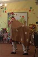 В этот раз взрослые и дети отправились в Простоквашино, где повстречались с героями данного мультфильма – кот Матроскин веселил детей, внимательно слушал стихи, которые с удовольствием рассказывали дети и подпевал осенние песенки. В завершении утренника прибежала веселая корова Мурка и станцевала для детей и их родителей забавный танец.