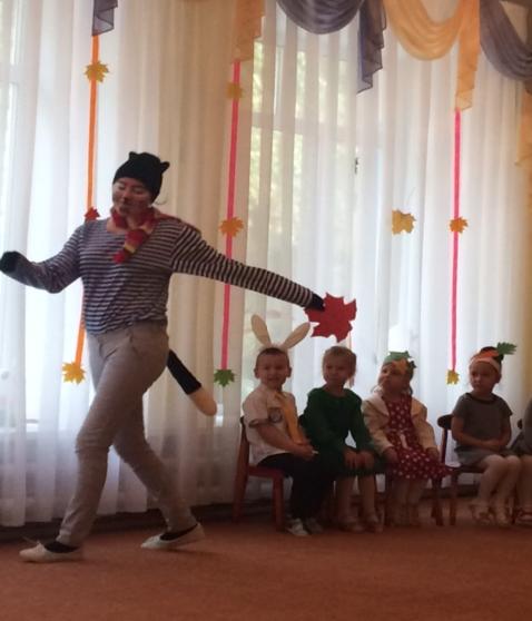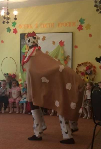 В этот раз взрослые и дети отправились в Простоквашино, где повстречались с героями данного мультфильма – кот Матроскин веселил детей, внимательно слушал стихи, которые с удовольствием рассказывали дети и подпевал осенние песенки. В завершении утренника прибежала веселая корова Мурка и станцевала для детей и их родителей забавный танец.