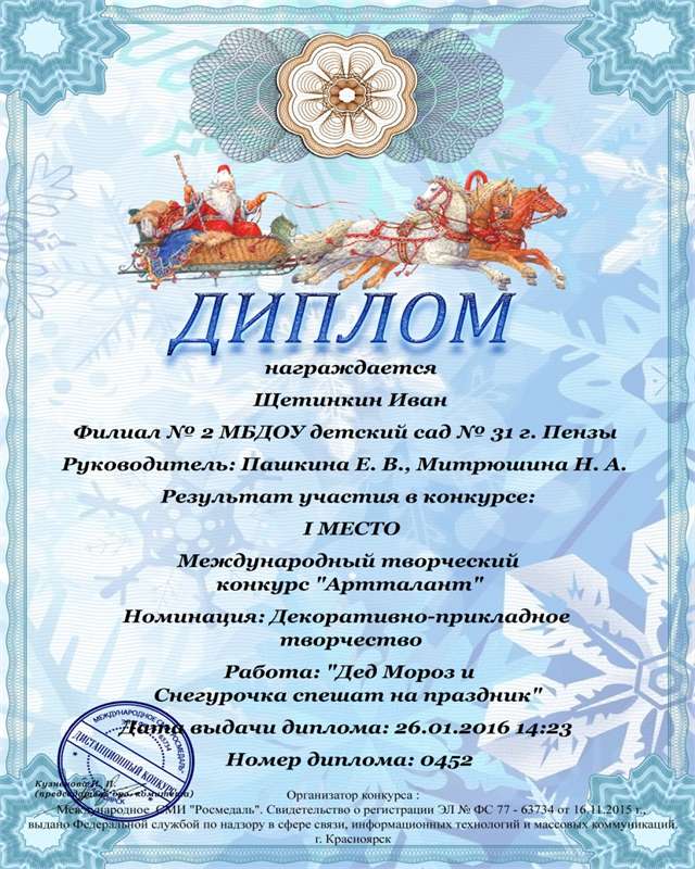 Подведены итоги международного творческого конкурса «Артталант», который проходил дистанционно в г. Красноярске. Воспитанник филиала № 2 «Акварелька» МБДОУ № 31 под руководством воспитателей Пашкиной Е. В. и Митрюшиной Н. А., и конечно же своих родителей, принял участие в творческом конкурсе в номинации «Декоративно – прикладное творчество» с работой «Дед Мороз и Снегурочка спешат на праздник». Необыкновенная творческая работа Ивана по аппликации, представленная на конкурс, отмечена дипломом за 1 место.