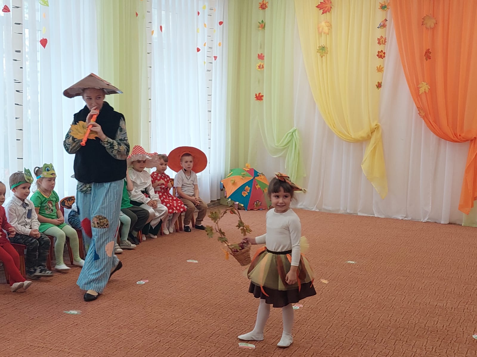 К детишкам в гости приходила Осень, Тучка и Лесовичок. Они вместе с малышами веселились, пели песни, танцевали и рассказывали стихи. А в конце праздника подарили сладкие подарочки.